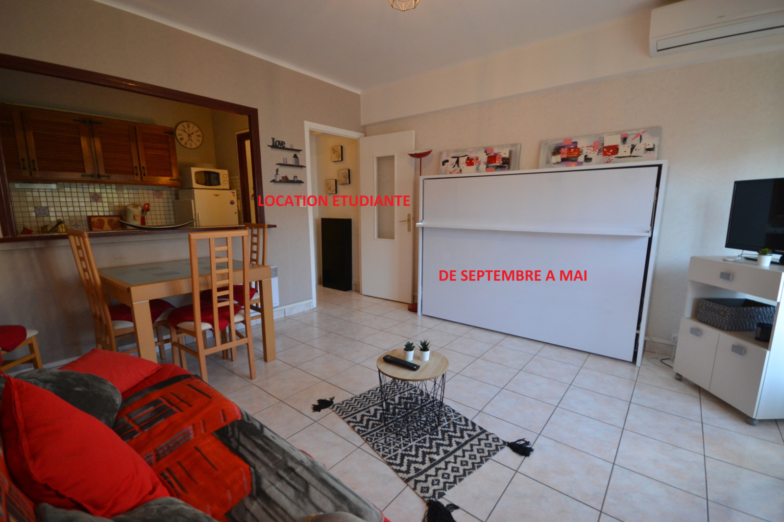 LOCATION ETUDIANTE Juan Les Pins, quartier résidentiel de Vilmorin, LOCATION ETUDIANTE de septembre à mai 2027, studio meublé de 28.44 m² en parfait état composé d'une cuisine indépendante, salle d'eau, climatisation réversible, séjour donnant sur terrasse ensoleillée au sud, proche commerces, plages, arrêt bus. Il est prévu dans le loyer les charges de copropriété, taxe d'ordures ménagères, à rajouter les consommations EDF et connexion wifi.